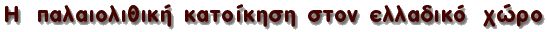 Η κατοίκηση εντοπίζεται σε σπήλαια, βραχοσκεπές και σε υπαίθριες θέσεις. Ελάχιστες είναι μέχρι στιγμής οι θέσεις της Κατώτερης Παλαιολιθικής, ενώ περισσότερα είναι τα στοιχεία για τη Μέση και την Ανώτερη Παλαιολιθική. Το γεγονός θα πρέπει να αποδοθεί εν μέρει στην έντονη τεκτονική δραστηριότητα στον ελλαδικό χώρο και στις αυξομειώσεις της θαλάσσιας στάθμης του Αιγαίου, που εξαφάνισαν κάθε ίχνος κατοίκησης από κάποιες γεωγραφικές περιοχές.
